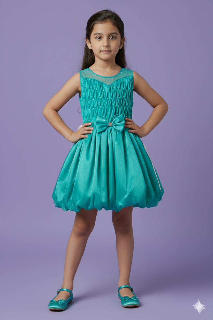 Let your little princess shine in this Aqua Sparkle Net Party Frock, designed to bring elegance and joy to every special moment. Crafted from premium satin and net fabric, the dress features a beautifully pleated bodice with delicate pearl embellishments and a shimmering layered skirt for a royal look. The satin bow with a crystal centerpiece adds a touch of glamour, while the soft inner lining ensures comfort for long wear. Ideal for birthdays, weddings, festive celebrations, or photo shoots — this frock makes your child stand out in style.