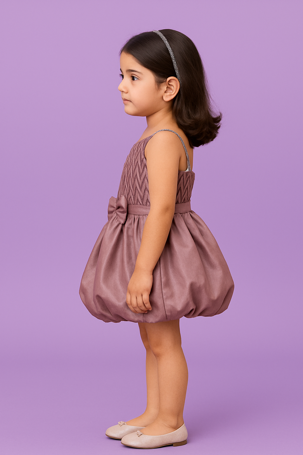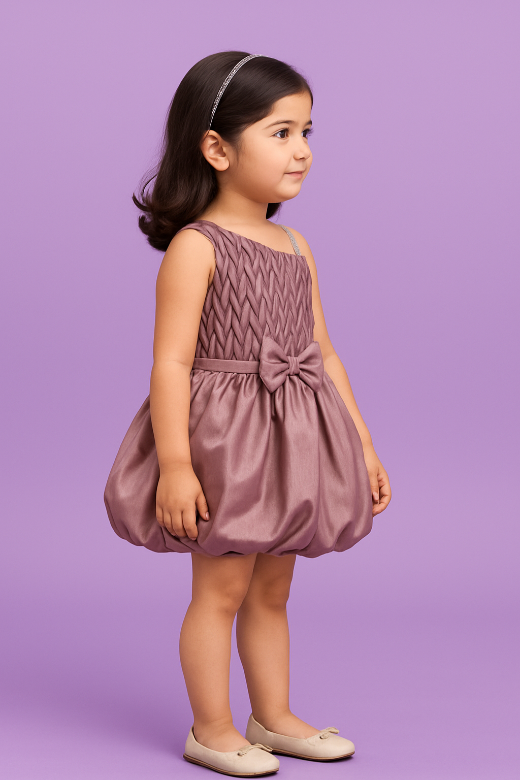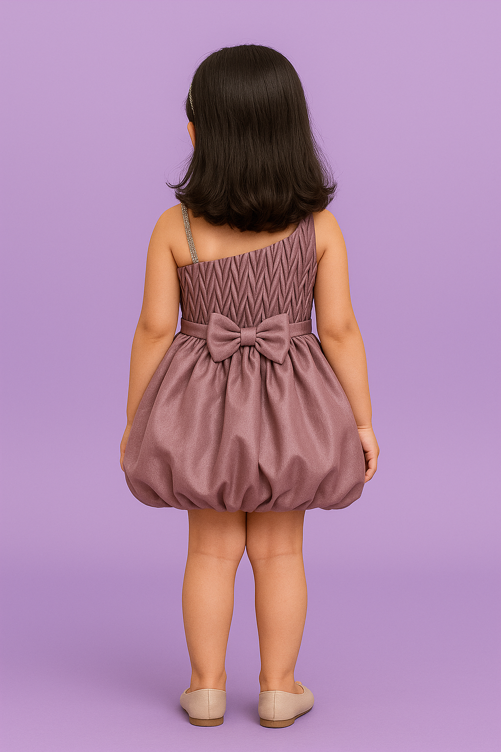 Dress your little princess in elegance with this stunning Mauve One-Shoulder Party Dress from Riddhima Fasion.