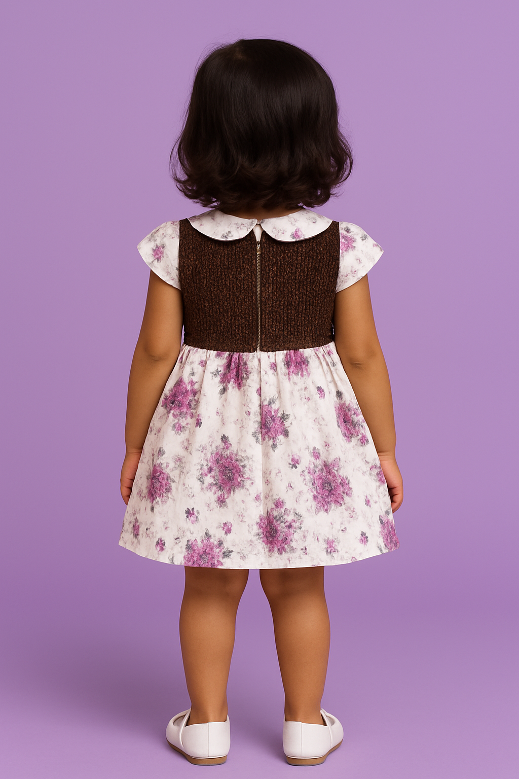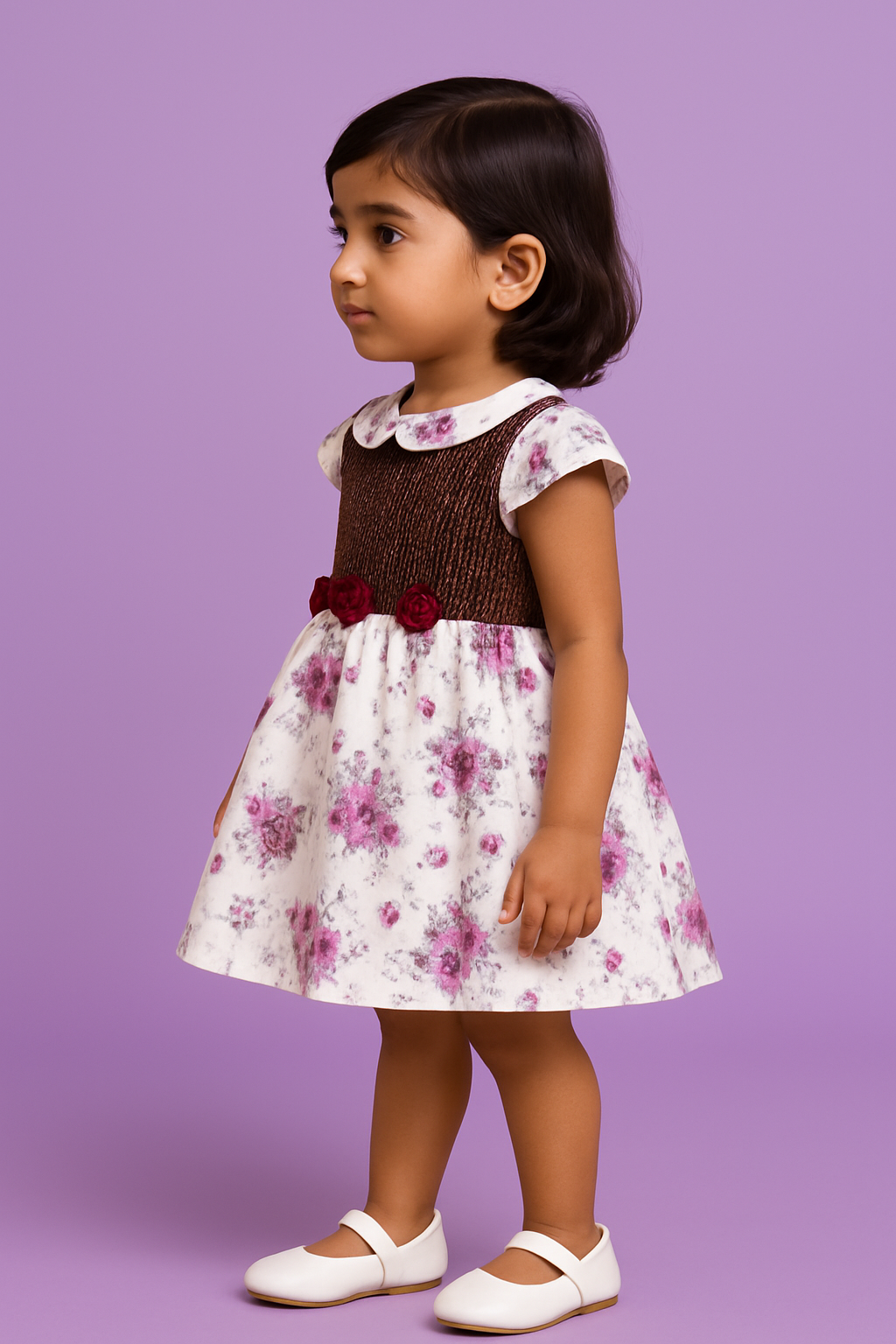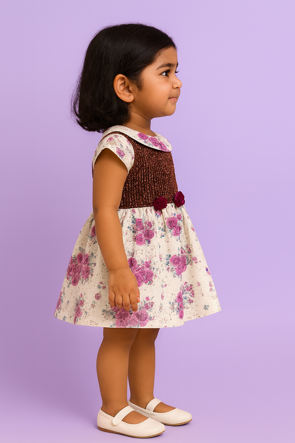 Make your little girl shine like a princess in this elegant floral party frock. The dress features a dazzling sequin-embellished bodice paired with a soft, flowy cotton-blend skirt adorned with beautiful floral prints. Designed with a peter pan collar and cute cap sleeves, it combines charm, comfort, and sophistication perfect for every special occasion.
