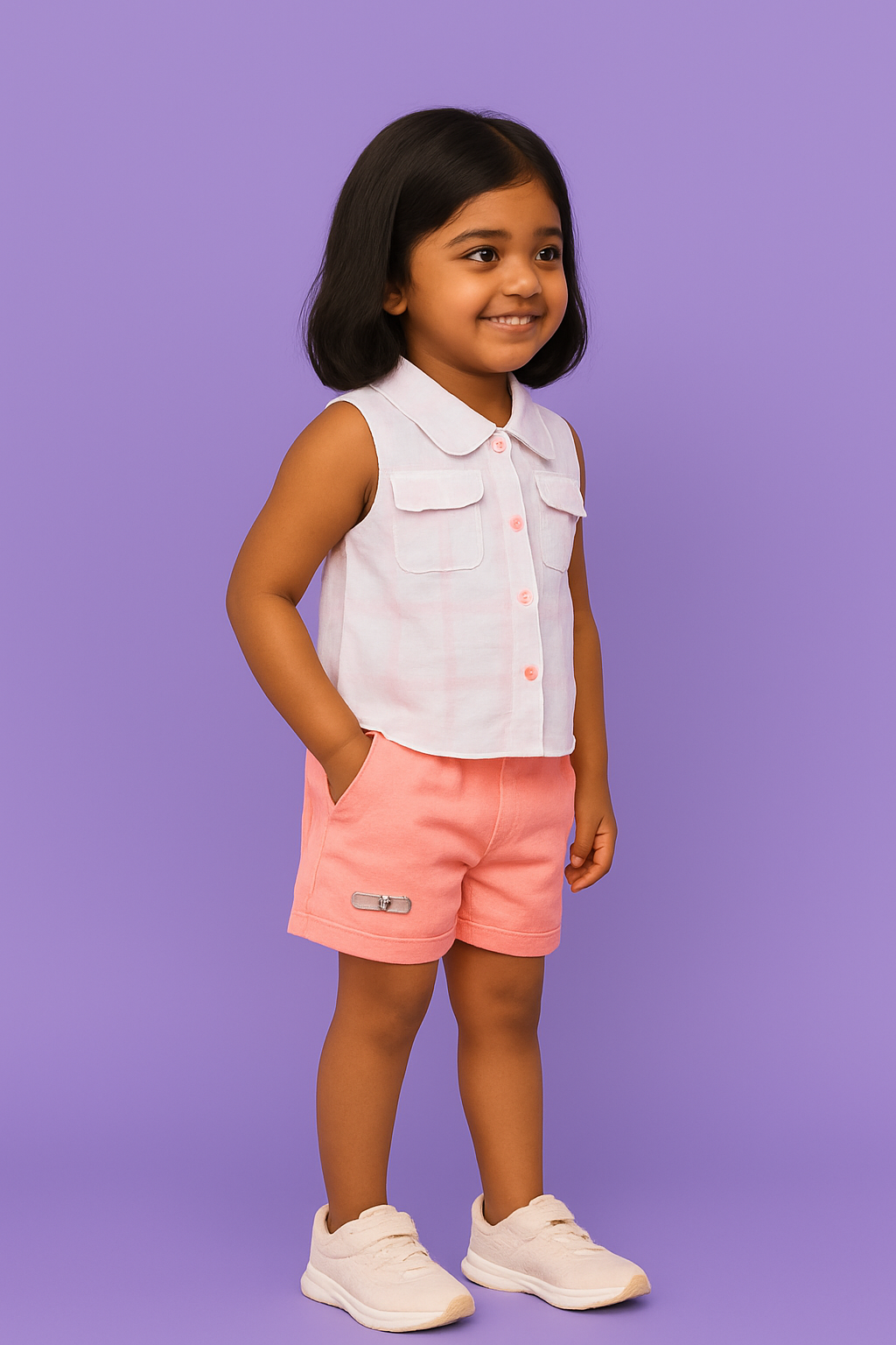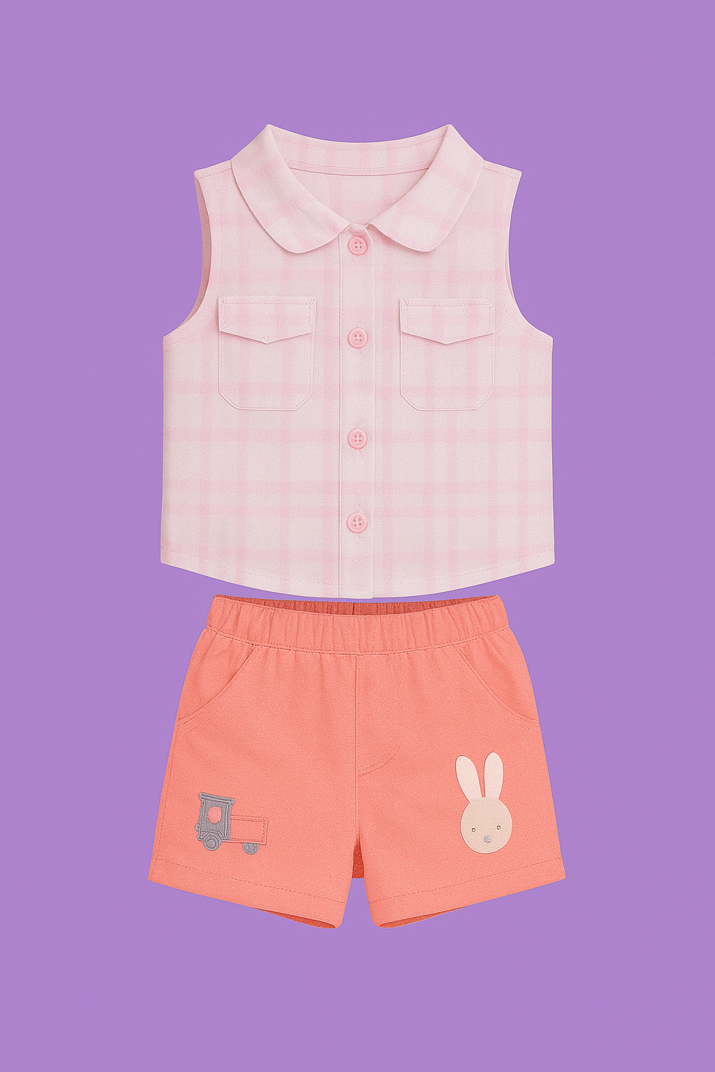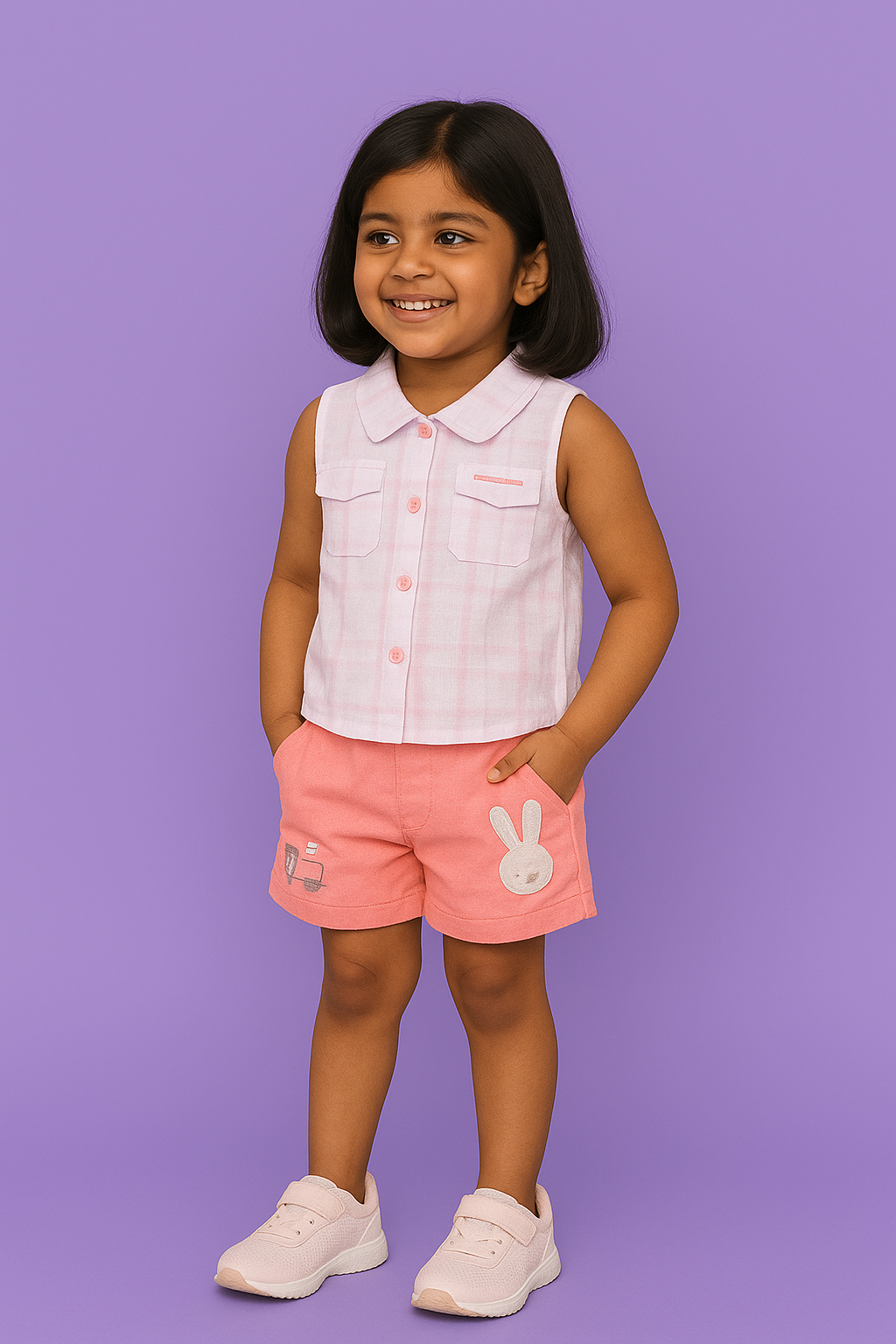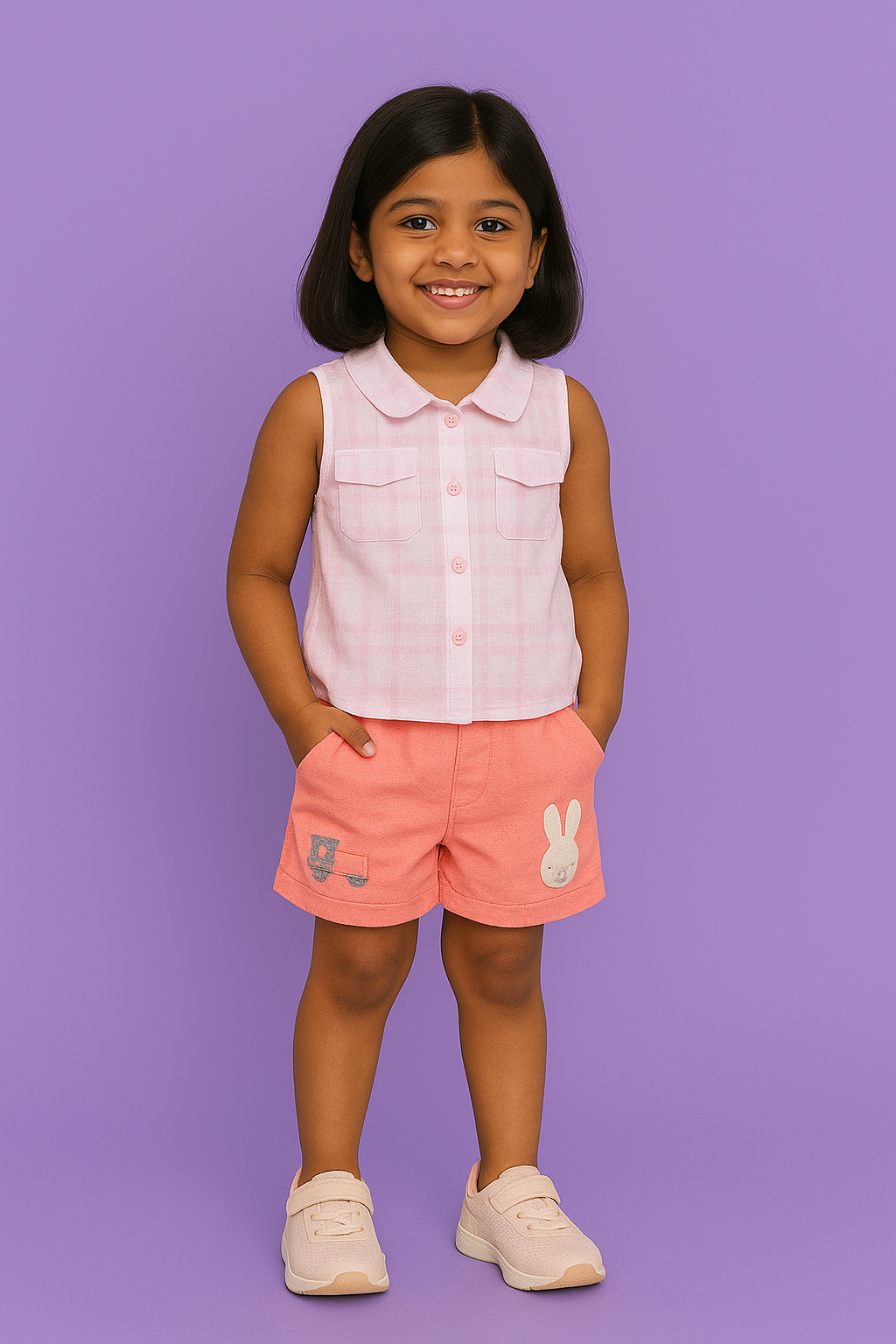 Add a touch of freshness to your little girl’s wardrobe with the Peachy Bloom Shirt & Hot Pant Set. The sleeveless plaid shirt in soft pastel tones features button detailing and stylish pockets for a trendy casual look. Paired with peach-colored hot pants adorned with playful embroidery and a cute bunny patch, this outfit is both fashionable and comfy. Perfect for summer outings, picnics, or casual playdates, it’s crafted from breathable fabric to keep your little one cool and happy all day long.