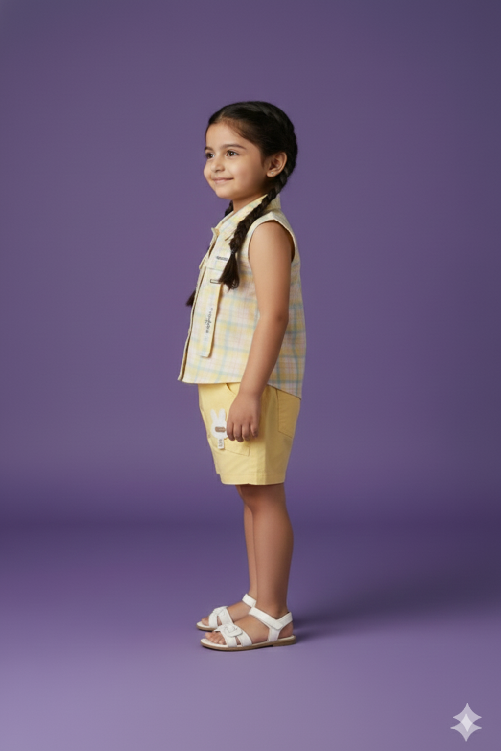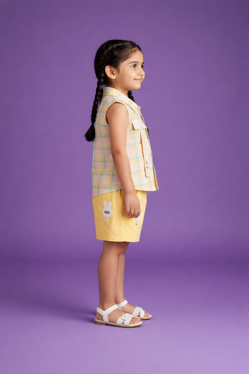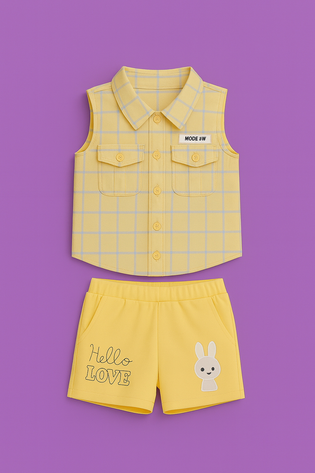 Bring a burst of sunshine to your little one’s wardrobe with this charming Tops & Hot Pant Set. The pastel plaid shirt is designed with button-down closure, puff sleeves, and cute embroidered details that add a touch of sweetness. Paired with cheerful yellow hot pants, featuring adorable bunny and “Hello Love” prints, this outfit is both stylish and comfortable.